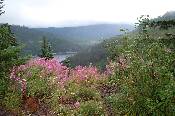 Lost Lake, with flowers in bloom. The road we were on continues back off our right shoulder, and then around the lake on the right hand side.