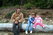 Ed, Moira, and Delaney sitting on the log long enough for a picture.