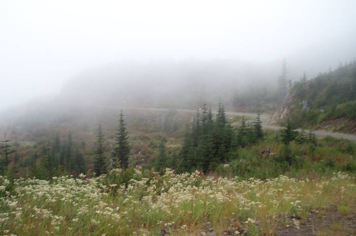 After that, we finally headed back. This is at the top of Naches Pass looking towards the east, with Rob the small light in the picture. It was foggy.