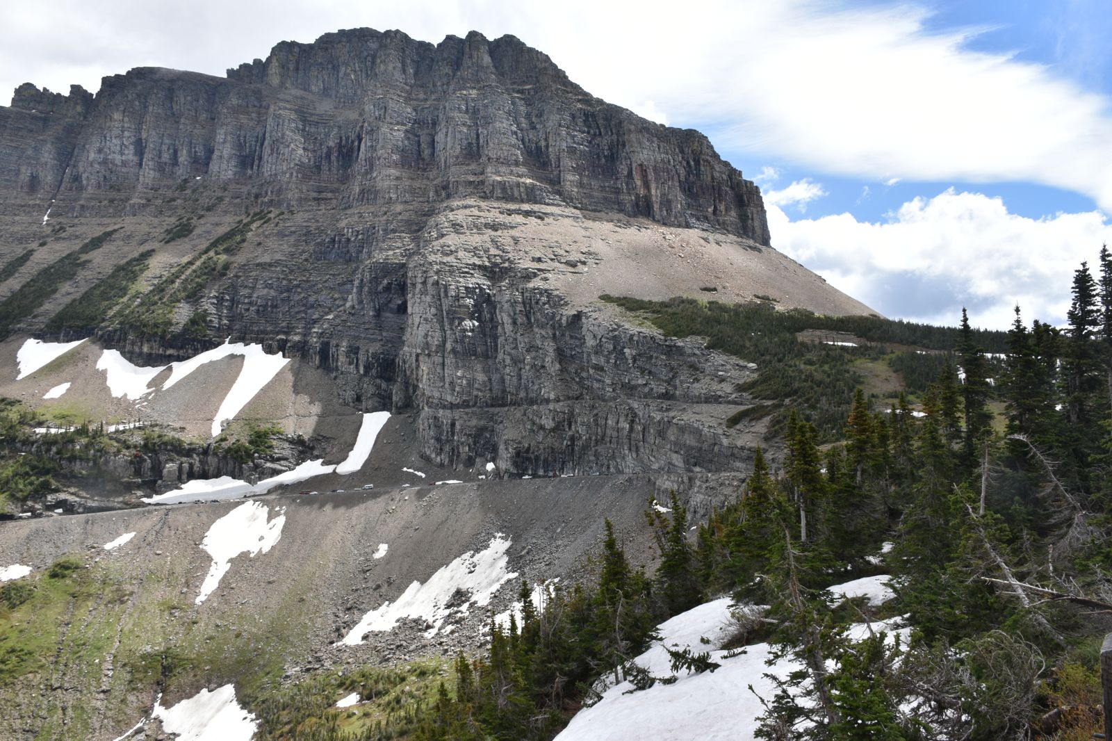 Just west of Logans Pass, there is a small overlook that we ventured to, and caught this picture. There is a trail above the road in this picture that was closed at the time, I believe it is called Highline Trail.