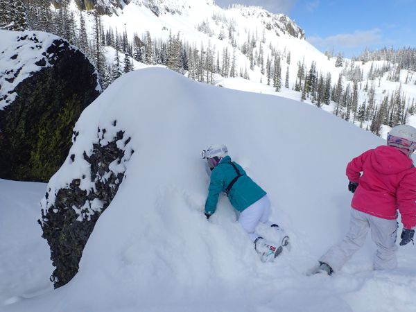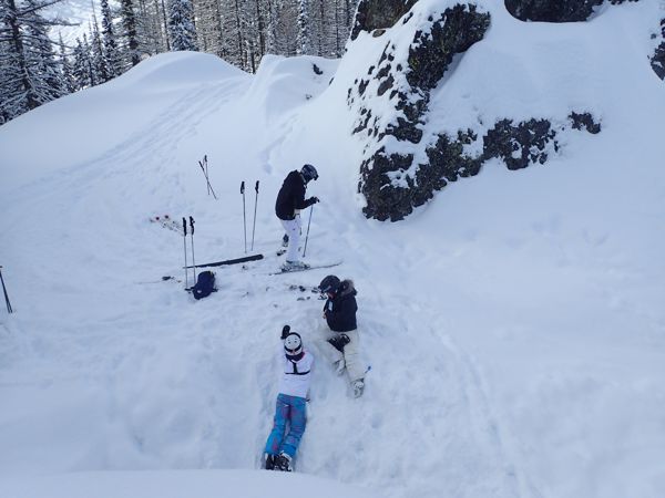 The girls have found a cat track, and half way down we have some trees, and rocks. Very very big rocks.