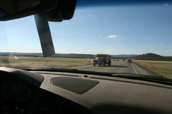 An old Yellowstone Bus. These were sold long ago, almost given away. Six (?) were later bought back and "restored" at a cost of about $300,000 each. They actually ride on a modern Ford E250 chassis.