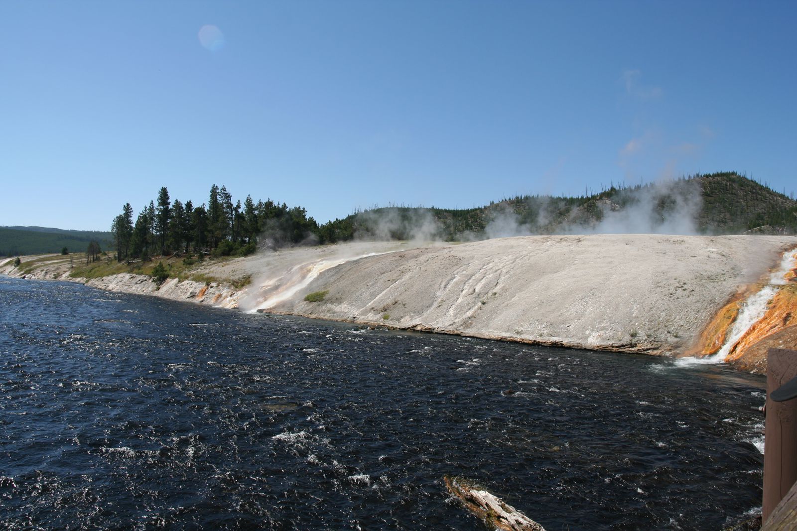 The view walking across the foot bridge to the Grand Prismatic Spring.