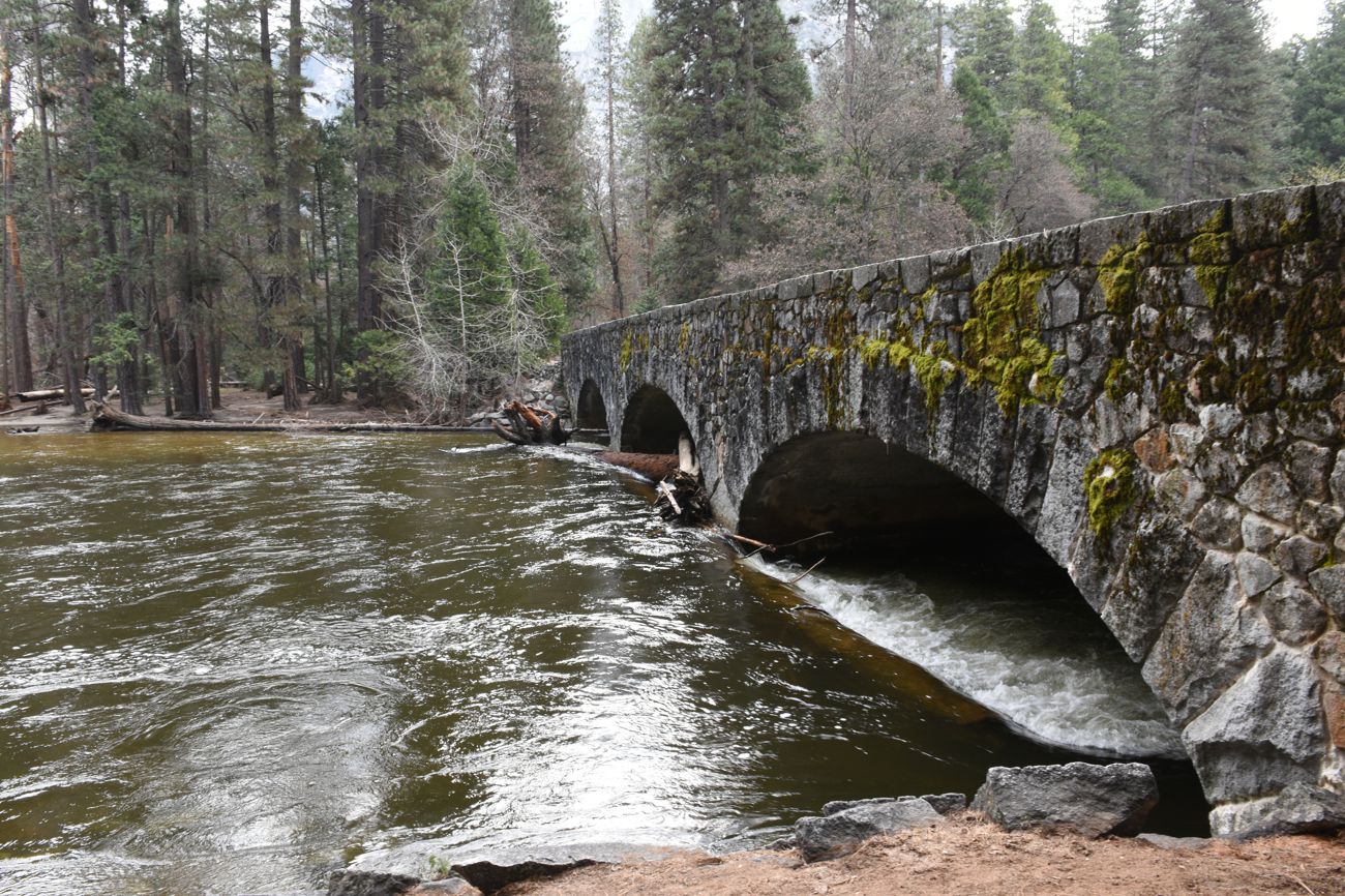 | Just past our cabin maybe 100 yards, this walking bridge, which looks like it used to carry cars, stood across the Merced river. These logs were piled up against it, causing quite a difference in water level. | ||