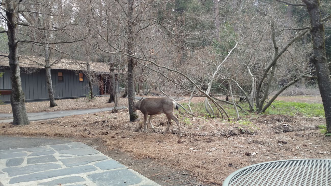 Kirsti was having an early morning beverage, and the local deer came out to eat as well.