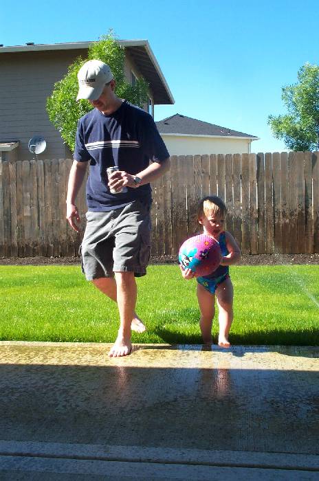 Moira and Uncle Brian in the back yard, playing in the sprinklers.