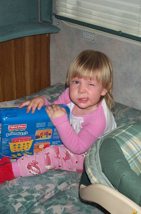 Our first night, Moiras in her PJs. Because the camera is present, she is winking.