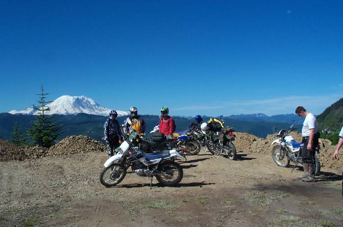 We started the day on FR7030, and at the T, went towards the right, and Naches. This is one of the first nice lookouts, with Mt. Rainier in the background. From left are Mike, Scott, Caleb, Rob, and Brians Arm.