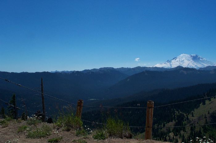 Mount Rainier to the right, falling fence in front. Two posts on this fence are literally held up by the fencing and posts on either side.