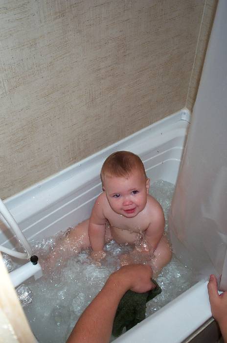 The 2nd day, and Delaney is taking a bath already. The tub in the trailer is just their size.